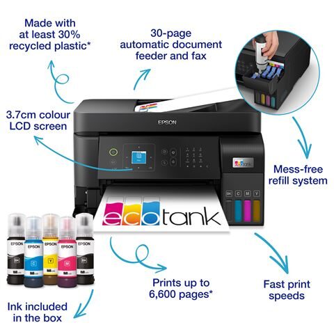 L5590, 33 SPM ( c/b) , 20 SPM ( u boji), 4800x1200 dpi, Ulazna ladica 100 Listova, Tip skenera Senzor za prep. slike (CIS), ADF [str.] 30 Listova, Duplex ne, USB, Ethernet, WiFi, Wi-Fi Direct, Tinte: C13T00S14A, C13T00S24A, C13T00S34A, C13T00S44A, C13T00S64A, Maintenance box: C12C934461