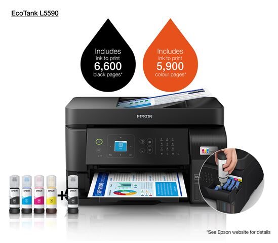L5590, 33 SPM ( c/b) , 20 SPM ( u boji), 4800x1200 dpi, Ulazna ladica 100 Listova, Tip skenera Senzor za prep. slike (CIS), ADF [str.] 30 Listova, Duplex ne, USB, Ethernet, WiFi, Wi-Fi Direct